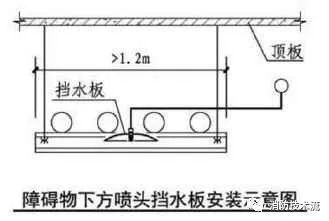 2 寬度大于本規范第7.2.3條規定的障礙物( 當梁、通風管道、成排布置的管道、橋架等障礙物的寬度大于1.2m時;采用早期抑制快速響應噴頭和特殊應用噴頭的場所,當障礙物寬度大于0.6m時。),增設的灑水噴頭上方有孔洞、縫隙時,可在灑水噴頭的上方設置擋水板。