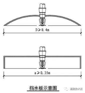 擋水板應為正方形或圓形金屬板,其平面面積不宜小于0.12m2,周圍彎邊的下沿宜與灑水噴頭的濺水盤平齊。除下列情況和相關規范另有規定外,其他場所或部位不應采用擋水板。