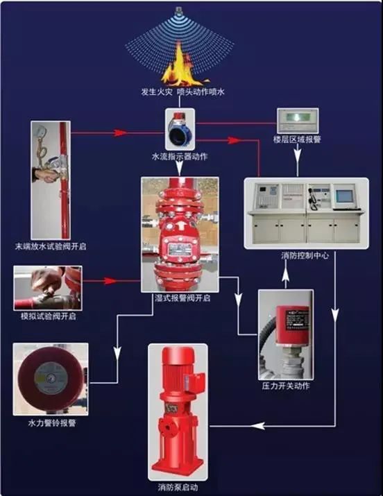保護區域內發生火災時,溫度升高使閉式噴頭玻璃球炸裂而使噴頭開啟噴水。這時濕式報警閥系統側壓力降低,供水壓力大于系統側壓力(產生壓差),使閥瓣打開(濕式報警閥開啟),其中一路壓力水流向灑水噴頭,對保護區灑水滅火,同時水流指示器報告起火區域;另一路壓力水通過延遲器流向水力警鈴,發出持續鈴聲報警,報警閥組或穩壓泵的壓力開關輸出啟動供水泵信號,完成系統啟動。系統啟動后,由供水泵向開放的噴頭供水,開放噴頭按不低于設計規定的噴水強度均勻噴水,實施滅火。