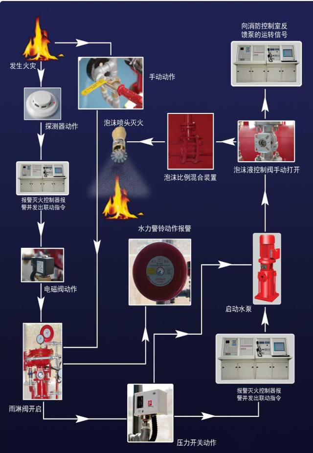 當保護區發生火災時,感溫感煙探測器探測到火災信號,通過火災報警滅火控制器,直接打開隔膜雨淋閥的電磁閥,使壓力腔的水快速排出,由于壓力腔泄壓,從而作用于閥瓣下部的水迅速推起閥瓣,水流即進入工作腔,流向整個管網噴水滅火(如值班人員發現火警也可以手動打開手動快開閥而實現雨淋閥的動作),同時一部分壓力水流向報警管網,使水力警鈴發出鈴聲報警、壓力開關動作,給值班室發出信號指示或直接啟動消防水泵供水。