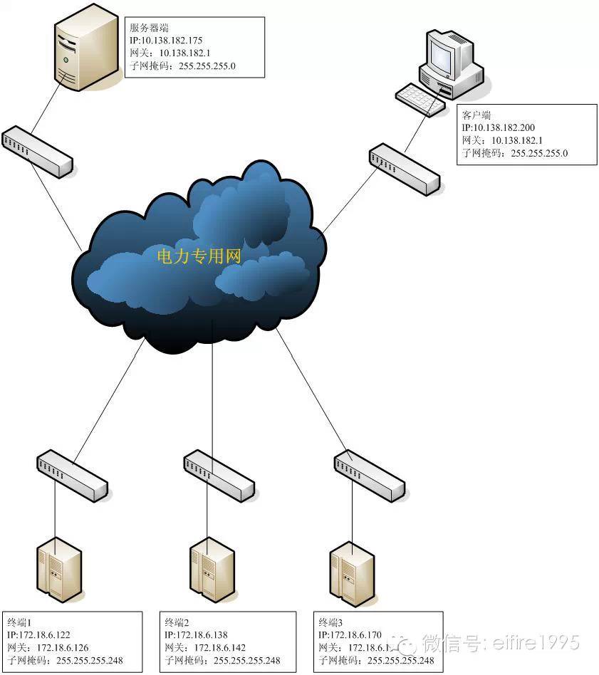 到達(dá)現(xiàn)場(chǎng)后,供電公司給出了如下圖所示的三個(gè)終端網(wǎng)絡(luò)參數(shù)、一個(gè)服務(wù)器端網(wǎng)絡(luò)參數(shù)、一個(gè)客戶端網(wǎng)絡(luò)參數(shù)(具體網(wǎng)絡(luò)結(jié)構(gòu)尚不清楚,初步簡(jiǎn)化為下圖)。