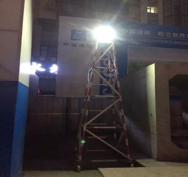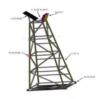 一種可移動式太陽能施工照明燈,包括一個可移動式燈塔架、太陽能蓄電池板及LED燈,每個燈塔架包括由一個可移動底座、4到6個可組裝式燈塔節,所述可組裝式燈塔節每個高1m,上下成椎體,最大燈塔節邊長為1米,最小燈塔節邊長為0.4米,可移動式底座由4個萬向輪組成,每個萬向輪均設置鎖定裝置,移動時將鎖定裝置解鎖方可移動。