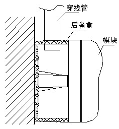 B-9310模塊后備盒與各類模塊的接線管路明裝時配合使用,可先根據工程現場情況,選擇后備盒底的一組合適的安裝孔,將后備盒安裝到墻壁上;再在后備盒側壁的適當位置根據穿線管尺寸打進線孔(也可在后備盒未安裝前打孔),將線接入后備盒后安裝模塊。安裝圖如圖: