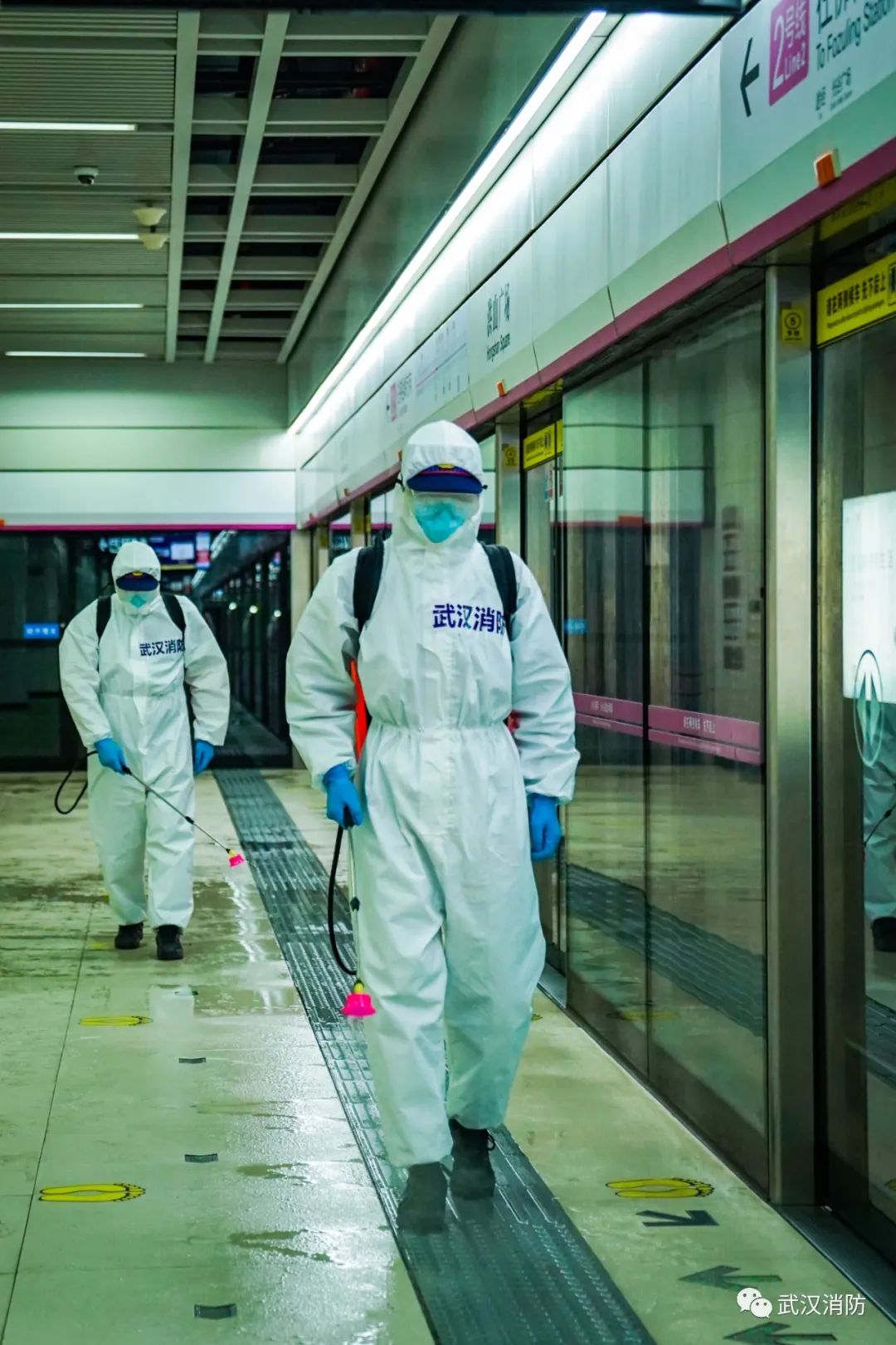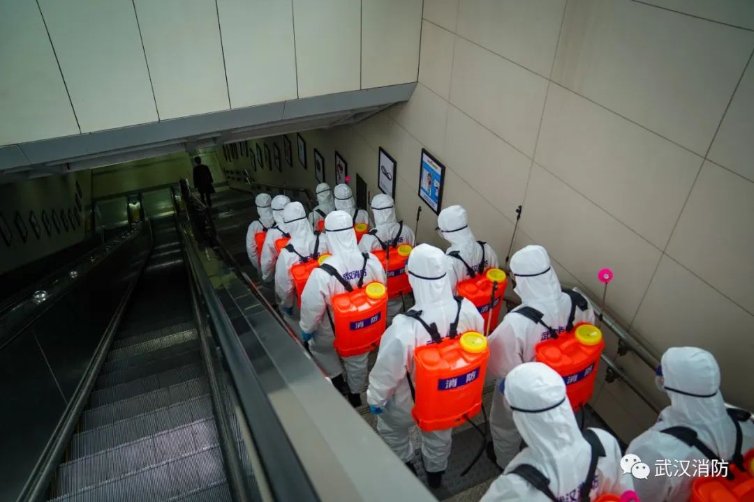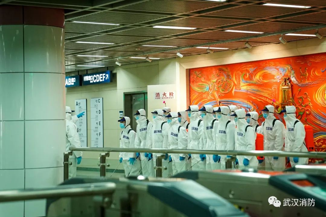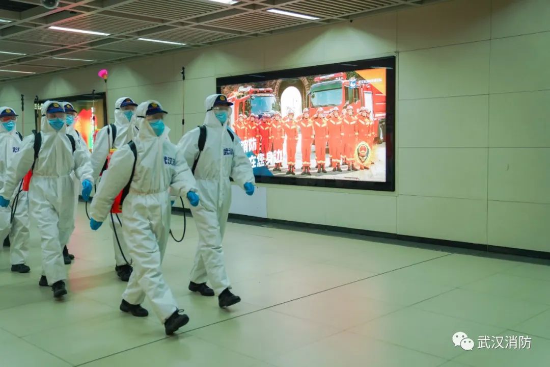 當天下午,武漢消防“119黨員突擊隊”15 名消防員進入武漢軌道交通 2 號線洪山廣場站內進行科學消毒