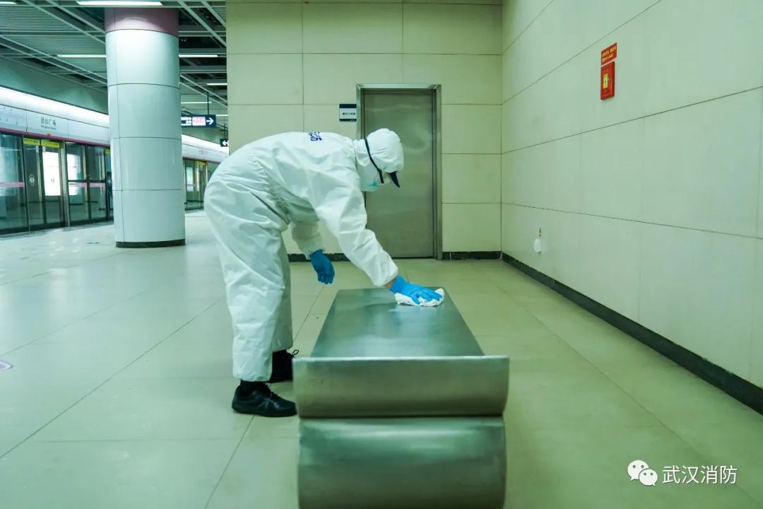 根據武漢地鐵運營公司從運營實際提出的相關建議,消防員們在疾控中心人員指導下對地鐵站內的客座椅、電梯扶手、售票機等乘客易接觸區域進行科學消毒工作。
