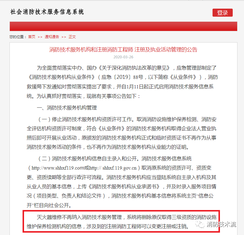 今天,社會消防技術服務信息系統轉發一則由江蘇消防救援總隊發布的《消防技術服務機構和注冊消防工程師注冊及執業活動管理的公告》,其中明確滅火器維修不再納入消防技術服務管理,系統將刪除原僅取得三級資質的消防設施維護保養檢測機構的信息。