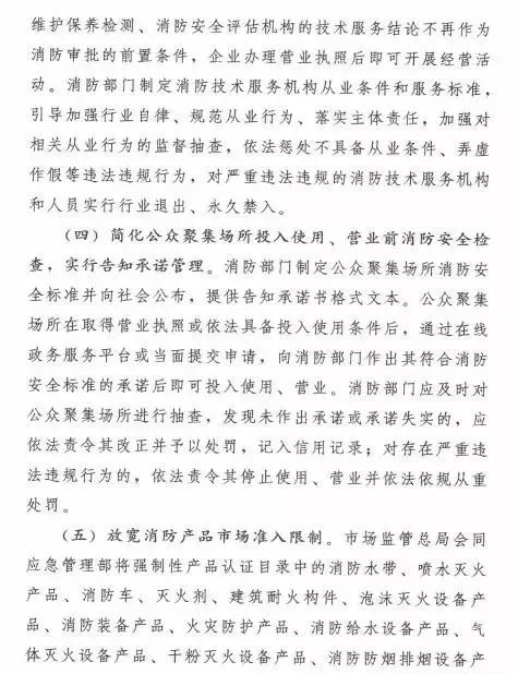 在簡政放權方面,取消和精簡3項消防審批。一是取消消防技術服務機構資質許可,取消消防設施維護保養檢測、消防安全評估機構資質許可制度,企業辦理營業執照后即可開展經營活動。二是簡化公眾聚集場所投入使用、營業前消防安全檢查,實行告知承諾管理,公眾聚集場所作出其符合消防安全標準的承諾后即可投入使用、營業。三是放寬消防產品市場準入限制,將強制性產品認證目錄中的13類消防產品調整出目錄,改為自愿性認證,僅保留公共場所、住宅使用的火災報警產品、滅火器、避難逃生產品的強制性產品認證;向社會開放消防產品認證、檢驗市場,凡是具備法定條件的認證、檢驗機構,均可開展認證、檢驗工作。消防部門制定消防技術服務機構從業條件和服務標準、公眾聚集場所消防安全標準,引導加強行業自律、規范從業行為,加強監督抽查,依法懲處違法違規行為,對嚴重違法違規的實行行業退出、永久禁入或者責令停止使用、營業。