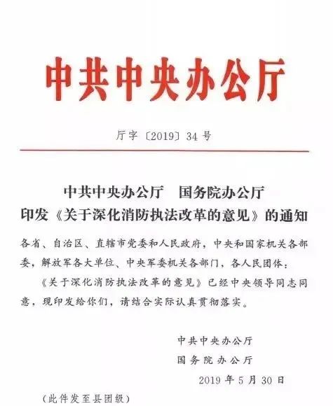 新華社北京7月28日電 2019年3月19日,中共中央總書記、國家主席、中央軍委主席習近平主持召開中央全面深化改革委員會第七次會議,審議通過了《關于深化消防執法改革的意見》(以下簡稱《意見》)。近日,中共中央辦公廳、國務院辦公廳印發了《意見》,并發出通知,要求各地區各部門結合實際認真貫徹落實。