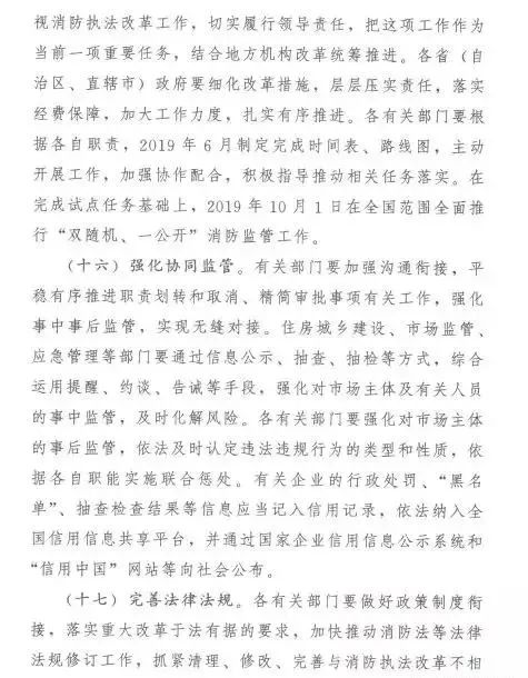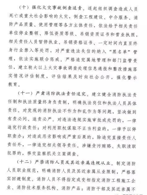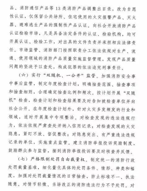 在加強事中事后監管方面,實行“雙隨機、一公開”監管,明確抽查范圍、抽查事項和抽查細則,合理確定抽查比例和頻次;針對火災多發頻發的行業和領域,適時開展集中專項整治,對隱患突出、有嚴重違法違規記錄的單位,實施重點監管;建立消防舉報投訴獎勵制度,鼓勵群眾參與監督;將消防違法違規行為記入信用記錄,嚴重違法失信企業納入“黑名單”管理,依法實施聯合懲戒;完善“互聯網+監管”,運用物聯網和大數據技術,實時化、智能化評估消防安全風險,實現精準監管;強化火災事故倒查追責,逐起組織調查造成人員死亡或造成重大社會影響的火災,倒查工程建設、中介服務、消防產品質量、使用管理等各方主體責任,嚴肅責任追究。