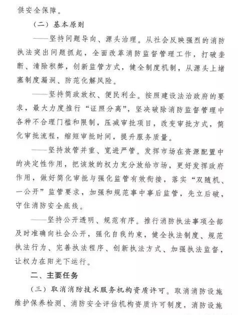 《意見》明確,消防執法改革要堅持問題導向、源頭治理,從社會反映強烈的消防執法突出問題抓起,全面改革消防監督管理工作,從源頭上堵塞制度漏洞、防范化解風險;堅持簡政放權、便民利企,最大力度推行“證照分離”,堅決破除消防監督管理中各種不合理門檻和限制,提升服務質量;堅持放管并重、寬進嚴管,把該放的權力充分放給市場,做好簡化審批和強化監管有效銜接,加強和規范事中事后監管,守住消防安全底線;堅持公開透明、規范有序,健全執法制度、規范執法行為、完善執法程序、創新執法方式、加強執法監督,讓權力在陽光下運行。同時,提出了消防執法改革5個方面12項主要任務。