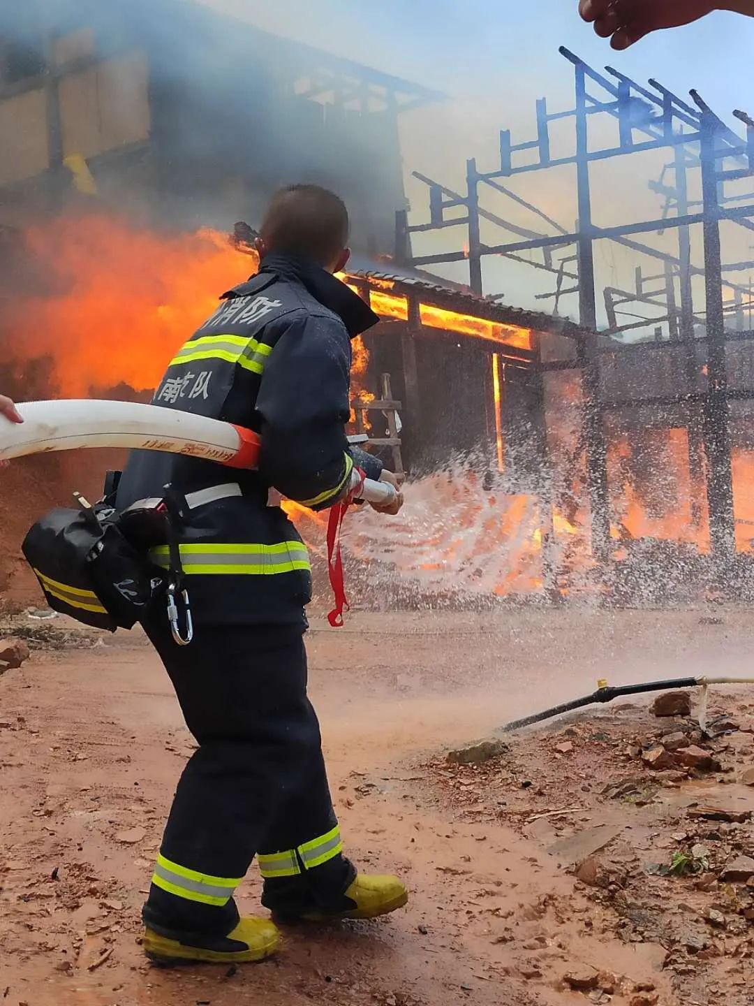 木結(jié)構(gòu)房屋實(shí)體火災(zāi)實(shí)驗(yàn)進(jìn)行中