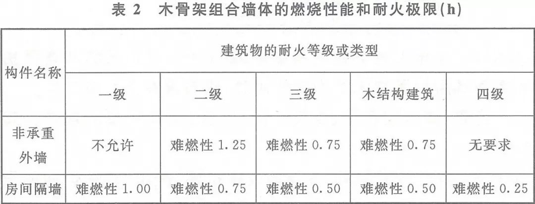(3)木骨架組合墻體的燃燒性能和耐火極限應符合下表2的規定,其他要求應符合現行國家標準《木骨架組合墻體技術規范》GB/T 50361的規定。