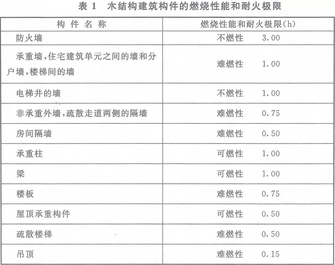 1、木結構建筑的防火設計可按本文的規定執行。建筑構件的燃燒性能和耐火極限應符合下表1的規定。