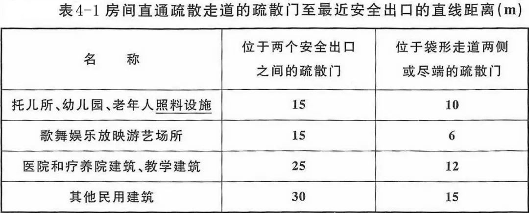 (2)房間直通疏散走道的疏散門至最近安全出口的直線距離不應大于下表4-1的規定;