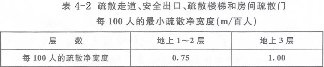 (4)建筑內疏散走道、安全出口、疏散樓梯和房間疏散門的凈寬度,應根據疏散人數按每100人的最小疏散凈寬度不小于下表4-2的規定計算確定;