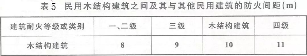 10、民用木結構建筑之間及其與其他民用建筑的防火間距不應小于下表5的規定。
