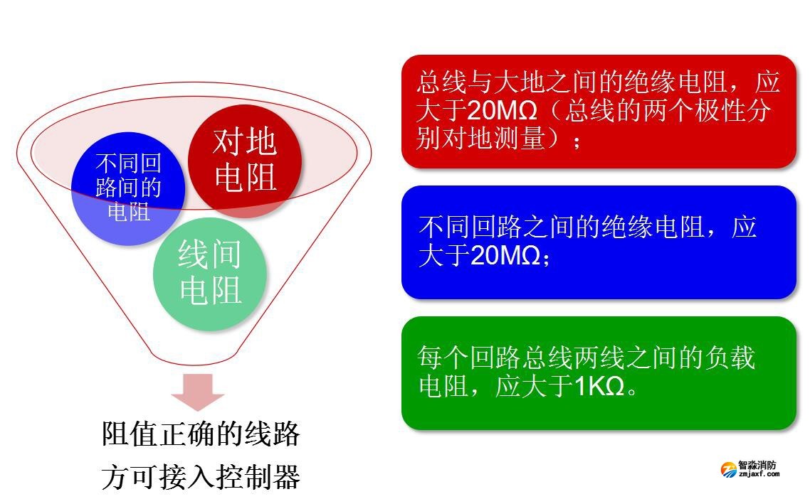 火災自動報警系統(tǒng)導線敷設后,在安裝現(xiàn)場設備之前,應對每回路的導線用500V的兆歐表(搖表)測量絕緣電阻,其對地絕緣電阻值不應