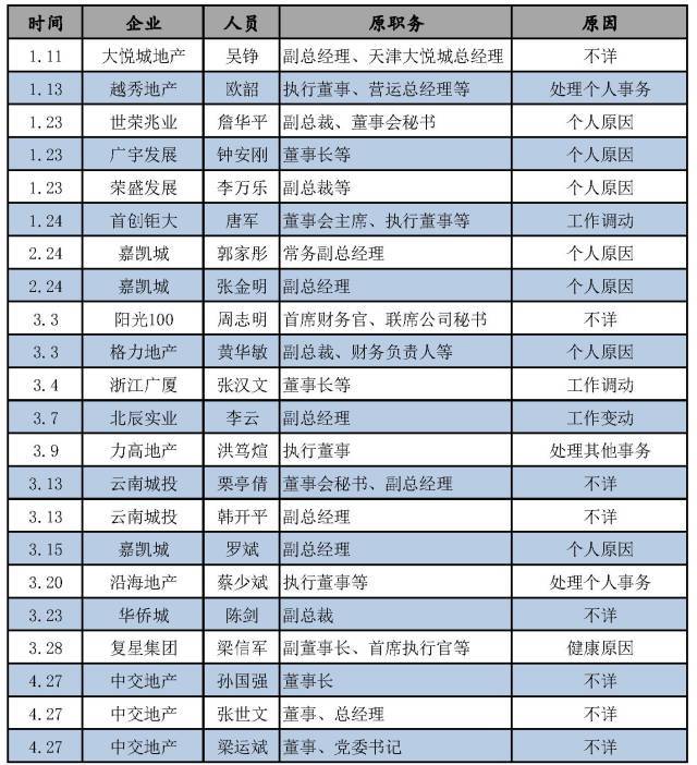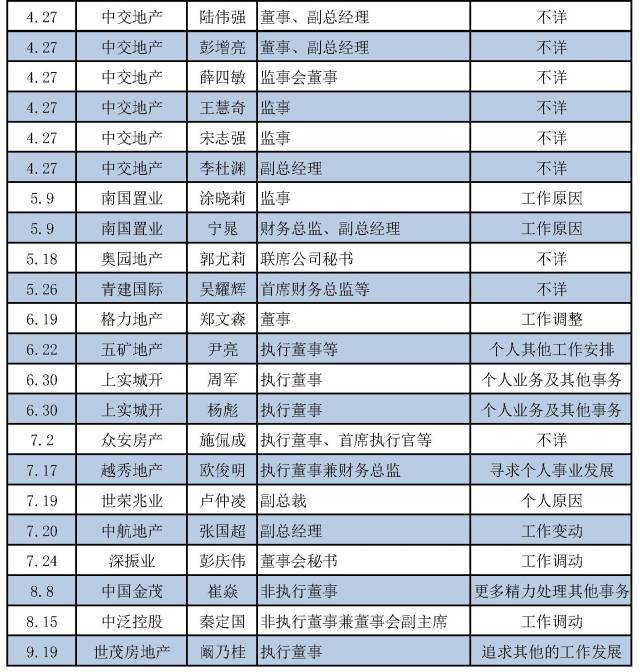 今年以來大部分房企高管的離職,都是自己提出辭呈,而公司公布的理由也是各有各的說法,曾一度引發外界各種猜測。在各種離職原因中,出現頻率最高的是“個人原因”以及“工作變動(或調動)”。