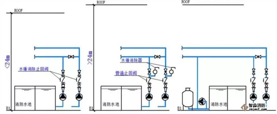 消防水泵出水管上的止回閥宜采用水錘消除止回閥,當消防水泵供水高度超過24m時,應采用水錘消除器。當消防水泵出水管上設有囊式氣壓水罐時,可不設水錘消除設施。