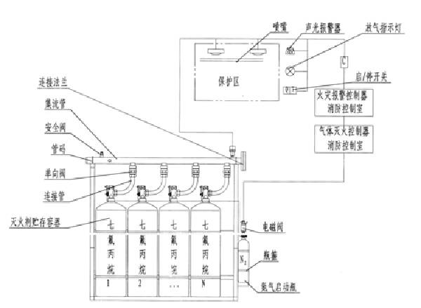 2)所有間隔必須密閉固定,藥劑噴放時無泄漏。系統采用組合分配方式,當某個保護區有火情發生時,煙、溫兩路探頭把火警信號傳至氣體滅火控制盤及控制室,聲、光自動報警并按照預定模式自動延時,啟動電磁閥及方向閥,使FM-200儲氣鋼瓶噴放氣體至發生火情的保護區, 也可以手動放氣或進行機械緊急啟動。