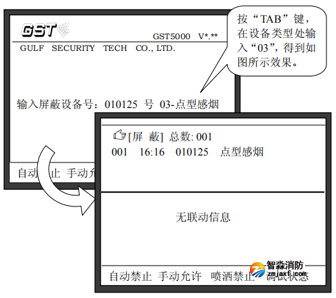 注意:在進行消防主機“屏蔽”操作中輸入設備的編碼時,可以使用通配符“*”,“*”代表這一位可以是0~9中的任意一個數字,這個功能可以方便的將一類設備取消屏蔽。例如:如果要屏蔽掉系統中所有的點型感煙火災探測器,我們可以在屏蔽操作時輸入:“******”,“TAB”,“03”,這樣所有點型感煙火災探測器將被屏蔽。其中“03”為點型感煙火災探測器設備類型代碼。