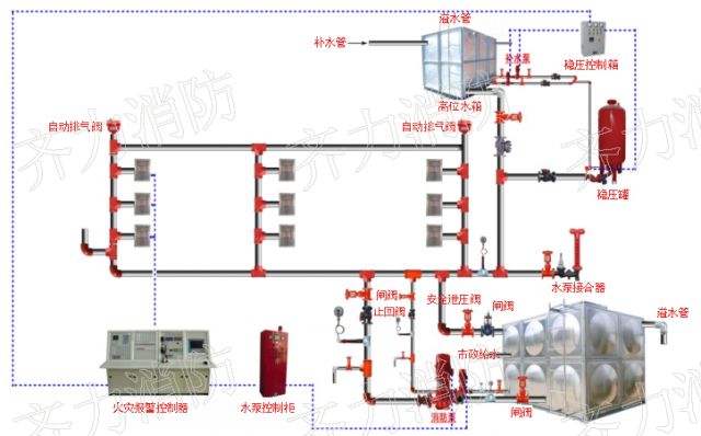 1)開啟最不利處末端試水裝置控制閥,查看水流指示器、壓力開關和消防水泵、電動閥的動作情況及反饋信號,以及排氣閥的排氣情況。