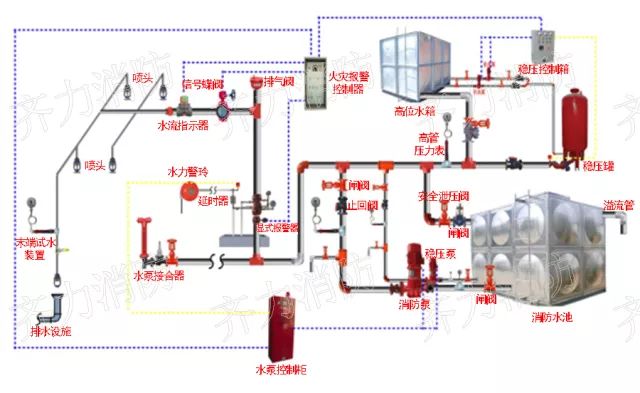 1)開啟最不利處末端試水裝置,查看壓力表顯示;查看水流指示器、壓力開關和消防水泵的動作情況及反饋信號。